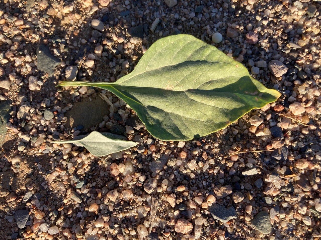 Brittlebush conserve water by growing smaller and paler leaves during dry years. Note the difference between these leaves grown with and without irrigation.