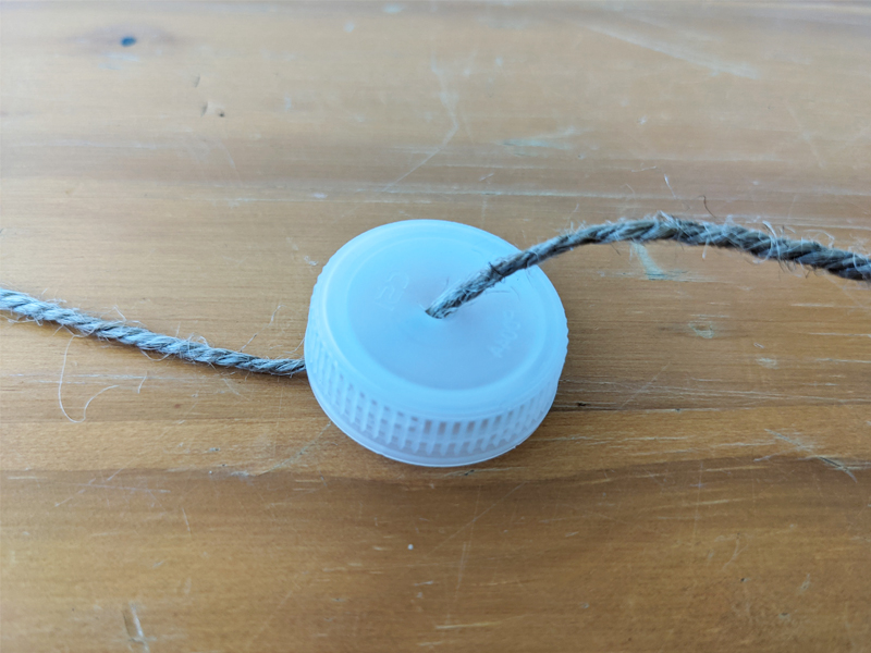 Put the twine through the hole in the bottle cap so the knot holds the twine in place and put the cap back on the bottle.