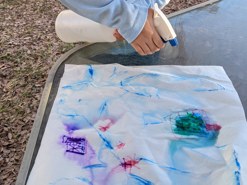 - Use a spray bottle to make it rain down on the watershed model paper until the colors run and bleed.