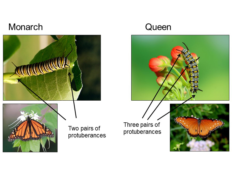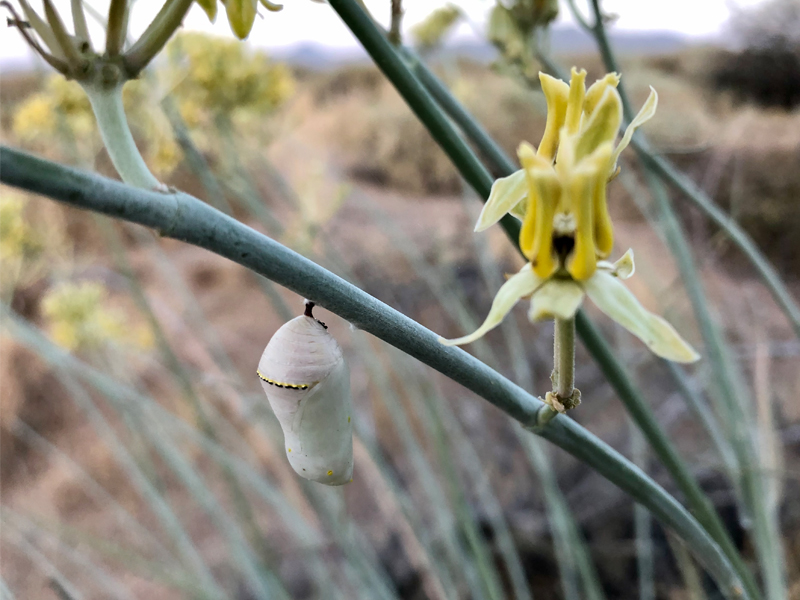 While making observations, keep in mind that monarch butterflies have a “cousin” in the metro Phoenix area that looks very similar. The queen butterfly (Danaus gilippus) also depends on milkweed plants and can sometimes be found on the same milkweed as monarchs. Adult queen butterflies have no black lines inside the forewings (the wings closest to their head) and free-floating white dots. If you find a white, yellow and black ca terpillar on milkweed, count the protuberances on the top of the caterpillar. Monarchs have two pairs and queens have three. Chrysalises are almost impossible to tell apart. Click here for more tips.