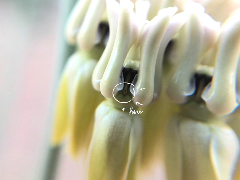 Milkweed plants produce some of the most complex flowers in the entire plant kingdom. Milkweed flowers do not produce loose pollen granules. Instead, they have waxy masses called pollinia. This pollinia is found at the base of milkweed flowers in what look like very small pinholes. These are called stigmatic slits. To attract pollinators, milkweed flowers produce a lot of nectar, attracting monarchs, bees and other insects. While trying to feed on the nectar, an insect’s leg can slip into this slit, where the sticky pollinia is waiting. If the insect is strong enough, it can pull its leg out of this sticky situation and fly away with the pollinia attached to hopefully deposit into another milkweed and pollinate it. See species that have been observed in metro Phoenix on iNaturalist.