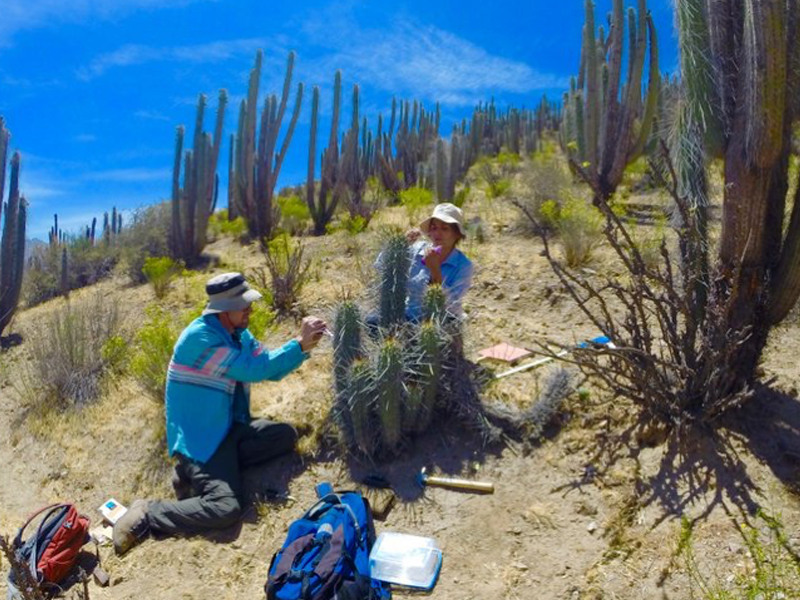 In 2018, Garden researchers, Raul Puente and Kevin Hultine travelled to Vicuña, Chile to learn from the Atacama’s extreme conditions, and from its plants and people. They set up study sites to research the potential impacts of climate change on one of that desert’s largest cactus species, Eulychnia acida. Known by local people as the copao, the massive cactus resembles the multi-armed organ pipes of the Sonoran Desert. The copao grow at elevations where there is absolutely no rainfall. Because they are so exceptionally well adapted, they survive on the only moisture available–coastal fog.