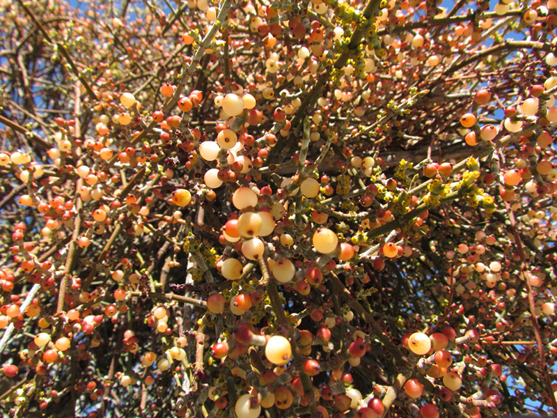 The vampiric desert mistletoe (Phoradendron californicum) is a parasitic plant, haunting the Plants and People of the Sonoran Desert Loop Trail. It sucks the nutrients out of unsuspecting trees and produces blood red fruits for birds to eat.