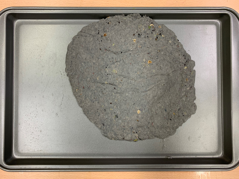 9. Spread the pulp into any shape you want. Hint: The pulp mixture should be as thin and flat as possible so it dries quicker.Spread paper pulp on cookie sheet